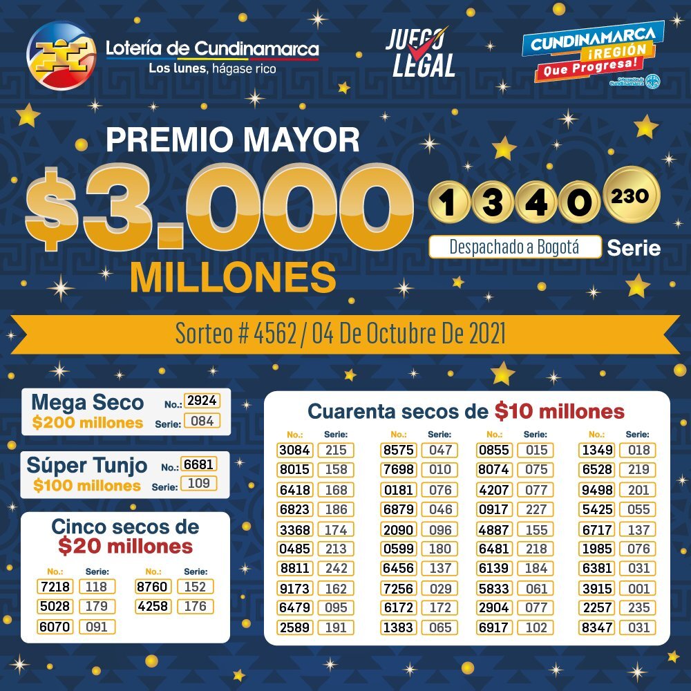 Deseas saber si has sido un feliz ganador de uno de los premios de la lotería de Cundinamarca en su más reciente sorteo 4562 del día Lunes 4 de Octubre de. Resultados para el sorteo Nro. Si eres uno de los afortunados GANADORES puedes ponerte en contacto con la Lotería de Cundinamarca.